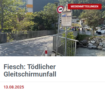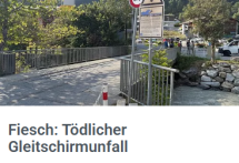 Am 12. August 2025 ereignete sich in Fiesch ein Gleitschirmunfall. Eine Person kam dabei ums Leben.